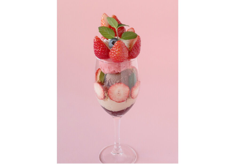 艶やかないちごがひと際目を引く季節限定パフェです。 スライスいちごの内側にはクランブルとカットいちごの和え仕立てを 忍ばせており、いちごが随所で楽しめる構成にしております。 自家製のミルクティーパンナコッタとカシスジュレが 上品な甘みと洗練された余韻を醸し、最後まで心地よい時間を紡ぎます。