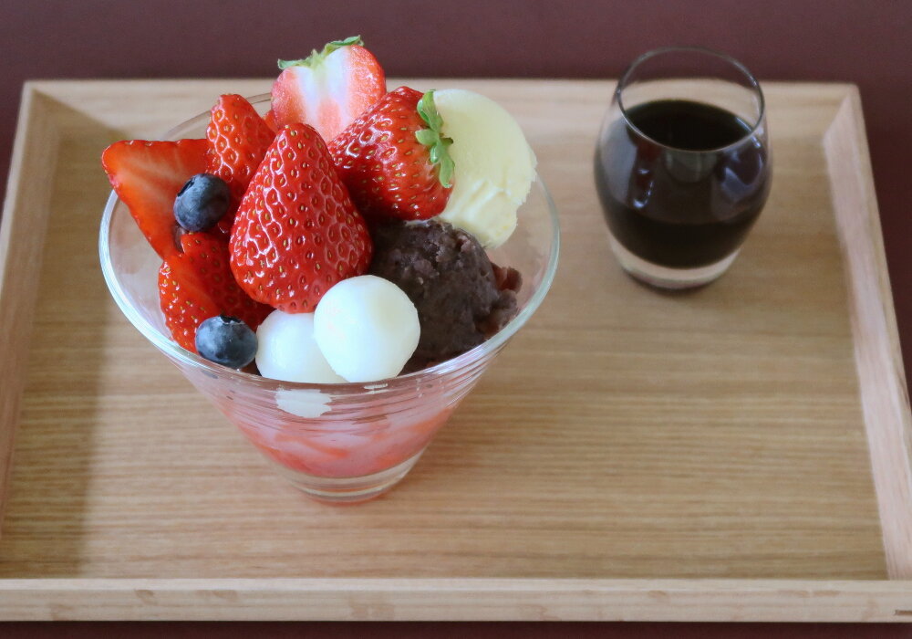 大粒いちご、特製いちごソースを組み合わせた クリームあんみつです。甘酸っぱい いちごがつぶあんやアイスクリームと良く合い、心地よい甘さと爽やかな後味をお楽しみいただけます。