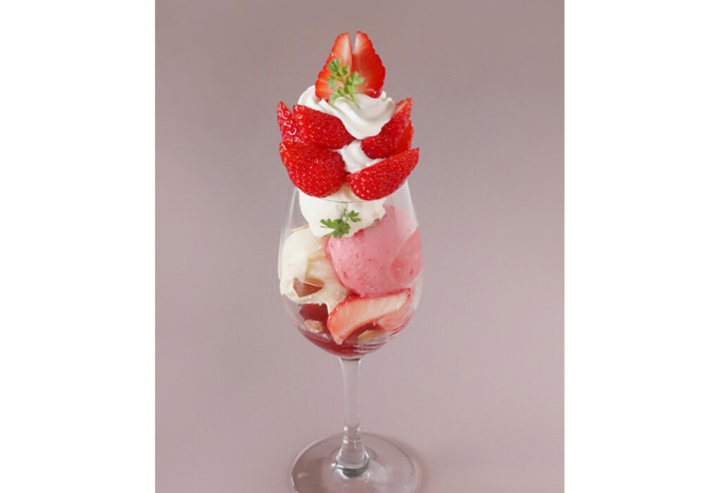 みずみずしいいちごを主役にした季節のパフェです。 くちどけなめらかなバニラアイス、酸味爽やかないちごアイスが織りなす調和に上品なホワイトチョコムースが優雅さを添えます。アーモンドとローズヒップティーゼリーの芳醇な味わいが重なり、華やかで洗練された味わいをお楽しみいただけます。
