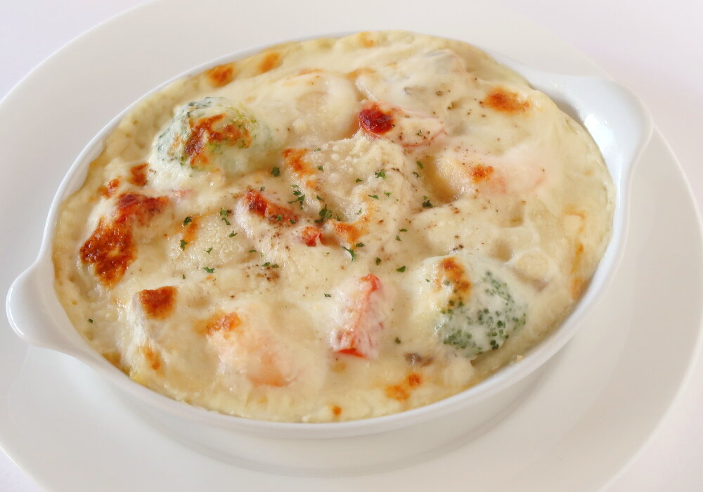 大ぶりの海老、れんこん、ブロッコリー、プチトマトなどの野菜が たっぷり入ったペンネグラタンです。 野菜をひと口大にカットしているので食べ応えがあり、 優しい味わいのベシャメルソースに具材の旨味が絡み、満足感ある一皿に。 食パンと一緒に美味しさを余すことなく召し上がるのもおすすめです。